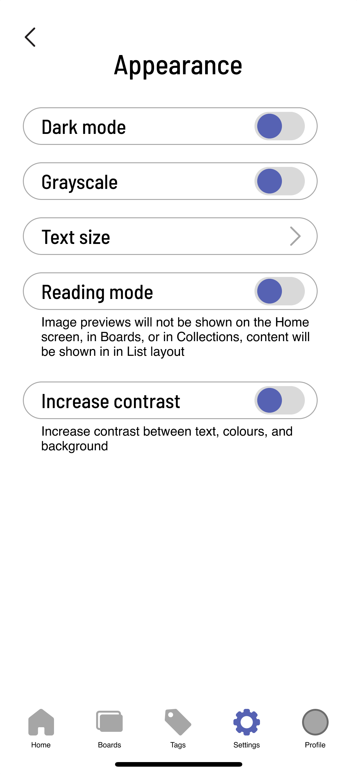 I created screens and task flows for most of the major tasks that can be completed in the app at this stage, including adding bookmarks and media, creating Boards, searching, and viewing Boards, items, settings, and profile. I also created a drag and drop process to demonstrate the manual sorting feature for Boards, Collections, and tags. At this stage I also decided on design elements like typeface, button design, and overlay menus, as well as designing my own icons. This was my first time using Figma, so I also had to figure out how to make things like scrolling and interactions work so I could demonstrate my app for the presentation. I determined how content previews with images would work, and developed a few as examples.